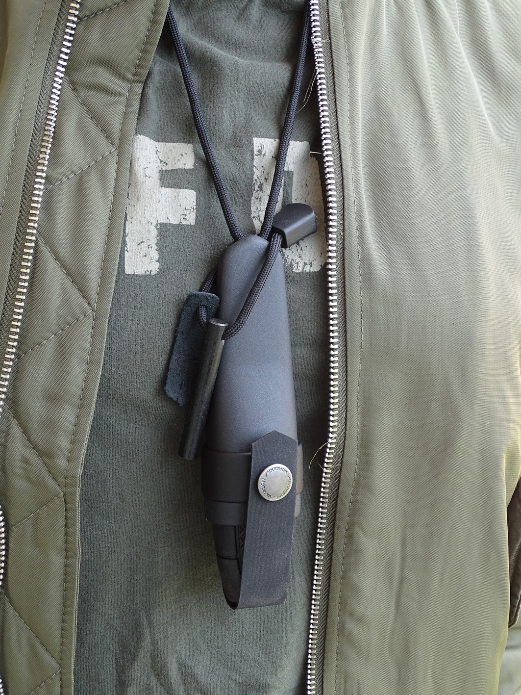 Beze strachu, že se o něj říznete až jej budete hledat. K noži si také můžete dokoupit poutko na opasek za 179,- nebo třeba poutko na nošení nože na krku. V tomto případě zaplatíte už 529,- ale dostanete celou sadu, kde je jednak zmíněné poutko, dále závěsná šňůrka a ještě křesadlo pro rozdělání ohně. Je to fajn nůž! Není to nic bojového ani ryze pracovního. Jde o univerzál, který je navíc moc pěkný.