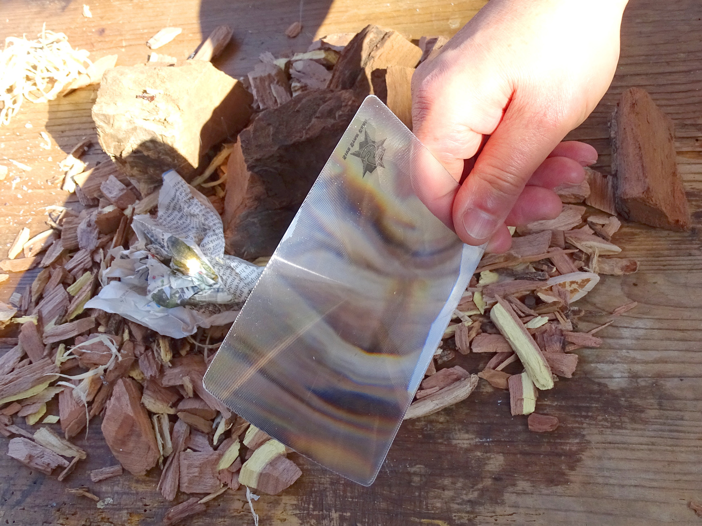 Vybral jsem právě takovouto polymerovou zvětšovací lupu od společnosti 5ive Star Gear a nestačil se divit, v tom pozitivním smyslu slova! Lupa či spíše plastová zvětšovací placka, protože rozměr této lupy je 120 x 85 x 0,5 milimetrů (hmotnost 7g), za nějakých doslova směšných 130,- kaček, rozdělá oheň za pár vteřin!!!