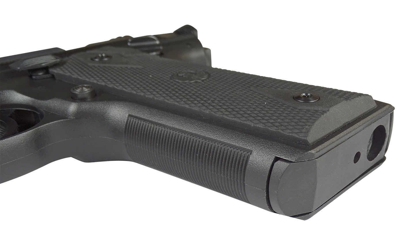 Polymerový rám jednak podstatně snižuje hmotnost pistole (944 gramů) a jednak podstatně zvyšuje komfort a užitné vlastnosti zbraně. Úhel úchopu je identický s Coltem 1911 a tudíž bude i mnohem lépe vyhovovat většímu procentu uživatelů. Polymerový rám ani nestudí, což zase střelec ocení v chladnějších měsících a díky své větší velikosti se i jistěji drží.